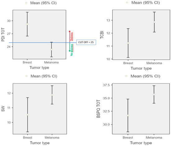 According to Bourdon’s suggestions [17], melanoma patients showed fewer negative physical and social consequences than breast cancer patients, which decreased their body image self-perception as physical and role functioning, experiencing more extensive and painful treatment. Breast cancer patients have higher psychological distress and low body image perception than melanoma patients; it is interesting to highlight the age effect across patient groups, with younger patients seeming to better impact the disease pathway.