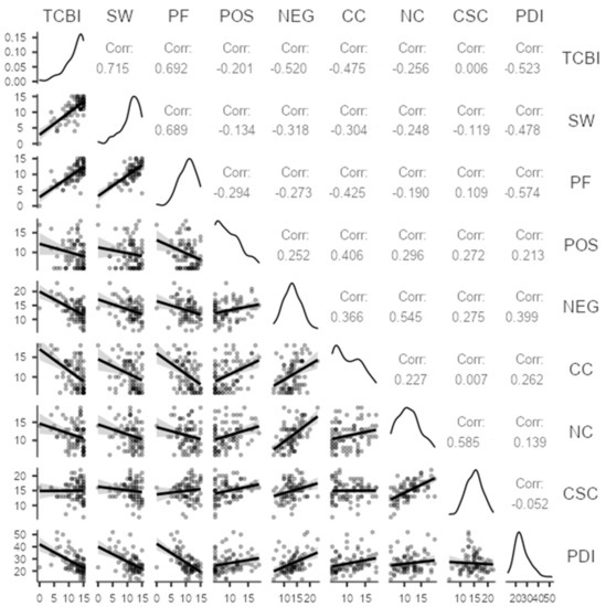 Further, we examined the relationship between body image perception (BSPq: TCBI, SW, PF) and psychological dimension (PDI), as well as metacognitive beliefs (MCQ-30: POS, NEG, CC, NC, CSC). We conducted a Pearson’s correlation analysis: the results are summarized in Figure 3. Psychological distress (PDI) was negatively correlated with consequences of clinical treatment on body image (TCBI) (r = −0.5; p < 0.001), well-being in social interaction (SW) (r = −0.4; p < 0.001), and well-being with own body (PF) (r = −0.5; p < 0.001). Then, metacognitive beliefs (MCQ-30) were negatively correlated with body image perception (BSPq): significant correlations emerged between TCBI and NEG (r = −0.5; p < 0.001), CC (r = −0.4; p < 0.001), NC (r =−0.2; p = 0.01); between SW and NEG (r = −0.3; p = 0.003), CC (r = −0.3; p = 0.005), NC (r =−0.2; p = 0.02); between PF and NEG (r = −0.2; p = 0.001), CC (r = −0.4; p < 0.001). Last, timing from diagnosis (time range 0–120 months) resulted in no significance.