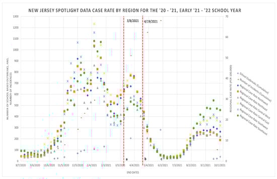 Aggarwal, J.; Gichura, M.W.; Campbell, M.L.F.; Nguyen, K.T.; Shendell, D.G. COVID-19 School vs. Community-Based Outbreak Trends among New Jersey K–12 Schools during the 2020–2021 School Year. Int. J. Environ. Res. Public Health 2022, 19, 9285. https://doi.org/10.3390/ijerph19159285