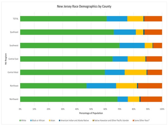 - United States Census Bureau. Decennial Census: Race. Explore Census Data. 2022. Available online: https://data.census.gov/cedsci/table?g=0400000US34%240500000 (accessed on 21 February 2022).