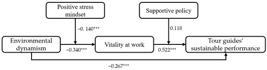 Firstly, we conducted a Structural Equation Model (SEM) to test the hypothesized direct and indirect effects using AMOS 21.0, and the path coefficients of the main variables are shown in Figure 2. The path coefficient between environmental dynamism and tour guides’ sustainable performance was significantly negative (β = −0.267, p < 0.001), which provided evidence for the negative effect of environmental dynamism on tour guides’ sustainable performance—H1 was supported. H2a about the negative effect of environmental dynamism on vitality at work and H2b about the positive effect of vitality at work on tour guides’ sustainable performance were significantly supported (β = −0.340, p < 0.001; β = 0.522, p < 0.001).