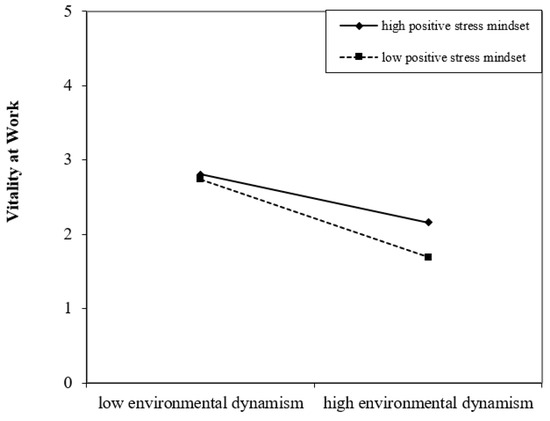 Similar to the test of mediating role above, we used PROCESS to test the moderating of a positive stress mindset and supportive policy. It was suggested that the interaction effect was supported if the 95% confidence interval of interaction terms did not include zero [67]. As is shown in Table 5, the 95% confidence interval of the interactions term of environmental dynamism did not include zero (β = −0.14, p < 0.01, 95% CI = [−0.24, −0.04])—Hypothesis 3 was supported. In order to observe the moderating effect of positive stress mindset more intuitively, referring to previous studies, we used the point which varied above and below the mean one standard deviation of a positive stress mindset to draw the interactive effect diagram of environmental dynamism and positive stress mindset (Figure 3). As can be seen from Figure 3, the influence of environmental dynamism on the vitality with high positive stress mindset was lower than that of tour guides with a low positive stress mindset.