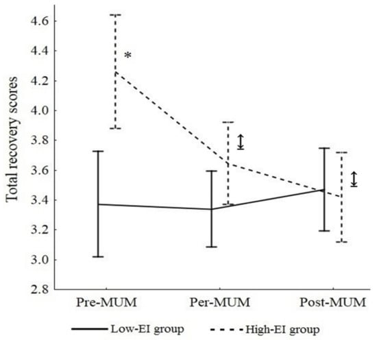 Total recovery score during MUM in high and low trait EI groups. Notes. * Mean of recovery for the high trait EI group significantly higher than the mean of recovery for the low trait EI group. ↨ Mean of recovery for the high trait EI group significantly higher at pre-MUM than per- and post-MUM and then the mean of recovery for the low trait EI group.