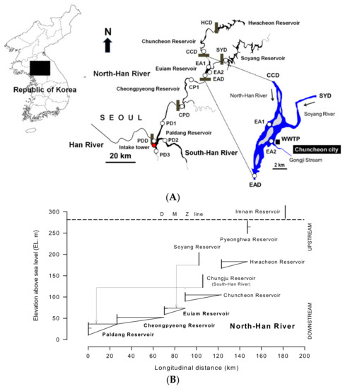 (A) Map and (B) schematic diagram showing the sampling stations and target study area (Euiam–Paldang Reservoirs) located in the North Han River and Han River system. Field study and data used were from January to December 2011. The EA2–EAD stations in Euiam Reservoir were additionally surveyed on 13 August and 19 September 2011. HCD, Hwacheon Reservoir dam; CCD, Chuncheon Reservoir dam; SYD, Soyang Reservoir dam; EAD, Euiam Reservoir dam; CPD, Cheongpyeong Reservoir dam; PDD, Paldang Reservoir dam; WWTP, wastewater treatment plant.