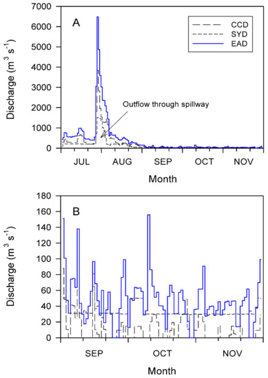 (A) Daily fluctuations in the outflow of the Chuncheon, Soyang, and Euiam Reservoirs (CCD, SYD, and EAD, respectively) of the North Han River from July to November 2011. (B) Expanded view from September to November 2011.
