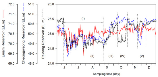 Comparison of daily water-level fluctuations (WLFs) in the Euiam and Cheongpyeong Reservoirs of the North Han River and Paldang Reservoir of the Han River from June to December 2011. The spillway discharging periods of the three reservoirs occurred simultaneously from 27 July to 5 August 2011. (I) Impound and discharge (II) Bloom potential (III) Proliferation of cyanobacterial bloom (IV) 1st transport and dispersion to Cheongpyeong Reservoir (V) 2nd transport and dispersion to Paldang Reservoir.