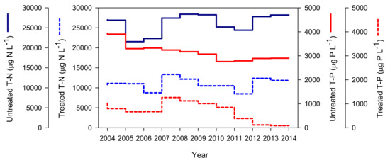 Comparison of the annual mean total nitrogen (TN) and total phosphorus (TP) concentrations in the untreated and treated wastewaters of the Chuncheon wastewater treatment plant located in the Euiam Reservoir watershed from 2004 to 2014. Chemical treatments to mitigate the total phosphorus load began in 2011 to 2012. Data were collected from the Annual Report of National Wastewater Statistics published by the Ministry of Environment (MOE), Republic of Korea.