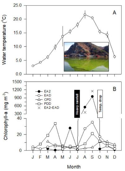 Spatial and temporal variations of the (A) chlorophyll-a concentration and (B) water temperature in the Euiam and Cheongpyeong Reservoirs (EAD and CPD, respectively) of the North Han River and Paldang Reservoir (PDD) of the Han River from January to December 2011. The inset photo shows massive harmful cyanobacterial bloom at the EA2–EAD site of Euiam Reservoir in September 2011.