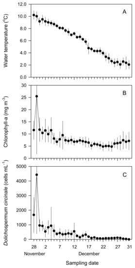 Daily variations of the (A) water temperatures, (B) chlorophyll-a concentrations, and (C) cell numbers of Dolichospermum circinale (formerly Anabaena circinalis) observed in four stations of the Euiam and Cheongpyeong Reservoirs of the North Han River and Paldang Reservoir of the Han River from 28 November to 31 December 2011.