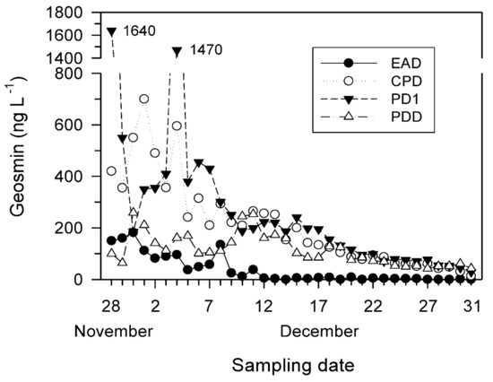 Figure 7 shows the daily variations in short-term GSM concentrations in the multiple-reservoir series from November to December 2011. GSM concentrations of >200 ng L−1 were observed at the CPD site (maximum 700.0 ng L−1) and at the PD1 (maximum 1640 ng L−1) and PDD sites (maximum 259.0 ng L−1). The GSM concentrations of >100 ng L−1 were maintained until mid-December (Figure 7). The EAD site had a concentration of 18.1 ng L−1, except at the end of November and early December 2011, which was not high compared with those of the other sites. The average values of the GSM concentration for each site were higher in the downstream than those upstream: EAD (44.0 ng L−1) < PDD (115.4 ng L−1) < CPD (198.6 ng L−1) < PD1 (233.2 ng L−1) (Figure 7 and Table 3).