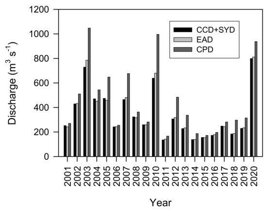 Spatial distribution of the total outflow discharged from the dams of the Chuncheon (CCD), Soyang (SYD), Euiam (EAD), and Cheongpyeong (CPD) Reservoirs between September and November every year for the past 20 years.