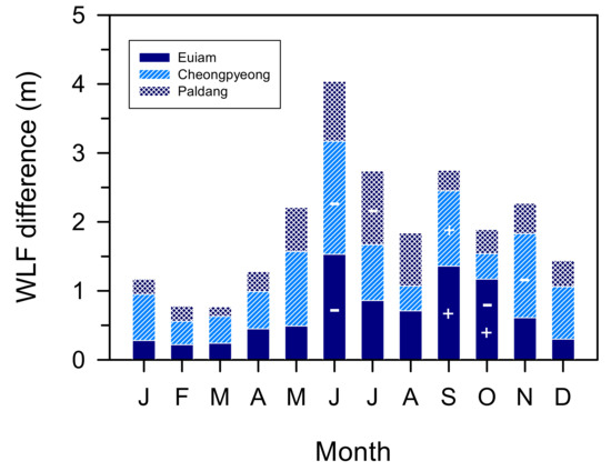 Spatial and temporal variability of the differences in the water-level fluctuations (WLFs) in the Euiam and Cheongpyeong Reservoirs of the North Han River and Paldang Reservoir of the Han River from January to December 2011. +, increase; −, decrease.