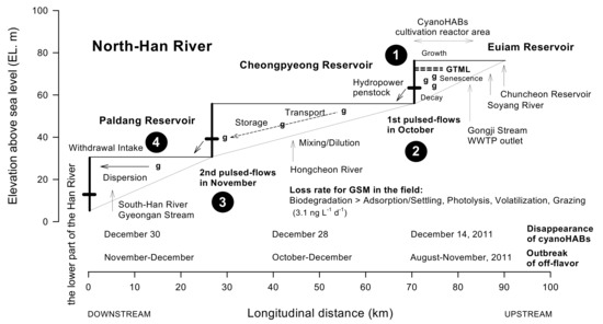 Thus, the purpose of this study was to understand the spatiotemporal dynamics of GSM based on harmful cyanobacterial blooms in a unique reservoir cascade in South Korea. Our results suggest the importance of monitoring the subsequent water quality impact caused by harmful cyanobacteria associated with hydropower-related effluents from reservoirs with continuously occurring harmful cyanobacteria because of increased eutrophication.