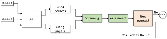 First, an initial list (described in the next paragraph) of a limited number of sources (entries) was produced. Then, papers cited in the latter entries were reviewed, as well as subsequent works citing the entries. Since we did not perform a systematic review, no rigorous inclusion or exclusion criteria were defined. Instead, we performed a subjective assessment whether the new entry either provided considerable new information or cited important sources related to the research questions. Regarding previous pandemics and the connection between health and wealth, works conducted after 9/11 (when the topic of emergency management became extensively funded) were subjected to additional scrutiny to exclude possible bias. The suitability of references was double-checked by a two-stage screening process: first screening by the first author (MY) with random control by the second author (YS), followed by a final assessment by both authors. Entries that passed the screening were added to the list. The above process was iterated several times, until no new sources providing considerable information were found. The process is illustrated in Figure 1. Since the search converged, we believe that the choice of initial sources was not crucial.