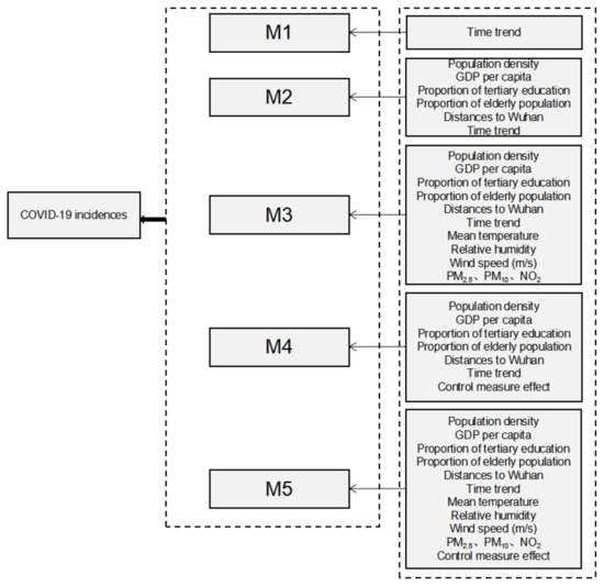 We compared five schemes: the M1 scheme only has time trend, the M2 scheme has city-specific characteristics and time trend, the M3 scheme has city-specific characteristics, meteorological factors, air pollution factors, and time trend, the M4 scheme has city-specific characteristics, stringency index variables and time trend, the M5 scheme has city-specific characteristics, meteorological factors, air pollution factors, stringency index and time trend (Figure 2). R2 proposed by Nakagawa and colleagues [35] is used to determine which scheme can best explain the variance of COVID-19 incidence rates. We use R2fixed to describe the proportion of variance explained by the fixed effect, and R2random to describe the proportion of variance explained by the random effect of urban heterogeneity. The relative risk (RR) and the corresponding 95% confidence interval (CI) are used to quantify the influence of these variables on COVID-19.