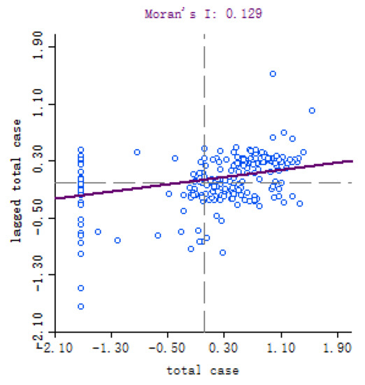 Moran’s I scatter plot of the cumulative number of COVID-19 on 8 April 2020.