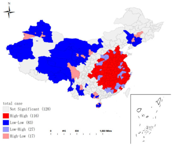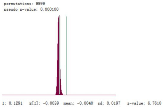 As can be seen from Figure 4, under the significance level of 0.05, Moran’s I of the cumulative confirmed cases on 8 April was 0.129, and z = 6.7610, z > 1.96, p = 0.0001, p < 0.05, which had statistical significance, indicating that the positive spatial autocorrelation of epidemic spread in the whole country.