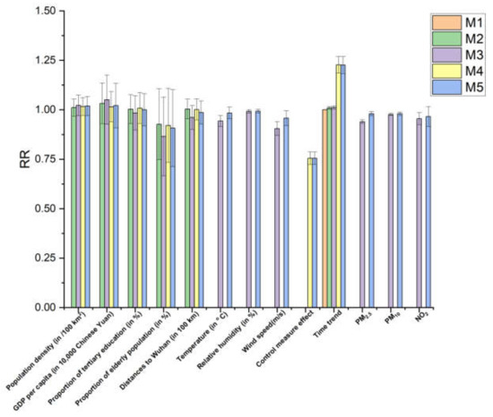 Figure 7 shows the comparison results of five schemes. Compared with M1, M2 with added city-specific characteristics can only explain 4.2% of the COVID-19 incidence rates variation. Based on the M2 scheme, adding meteorological factors and air pollutants as time-varying fixed effects to M3 can explain the 11.8% variation of the COVID-19 incidence rates. However, by adding control measures to the M4 scheme, the 45% variation of the COVID-19 incidence rates could be explained. The M5 scheme added meteorological factors and air pollutants based on the M4, and the explanation degree of the COVID-19 incidence rates variation was only 1% higher than the M4 scheme. By comparing and analyzing the results of the five schemes, it can be found that the control measures significantly impacted the COVID-19 incidence rates, which can explain the 34.2% (R2fixed of M5 minus R2fixed of M3) variation of the COVID-19 incidence rates. On top of this effect, including the meteorological factors and environmental pollutants in the M5 only resulted in 1% increase in the explained variance even though temperature, relative humidity, wind speed, PM2.5, PM10, and NO2 showed a statistically significant association with the incidence rate of COVID-19 (Figure 6).