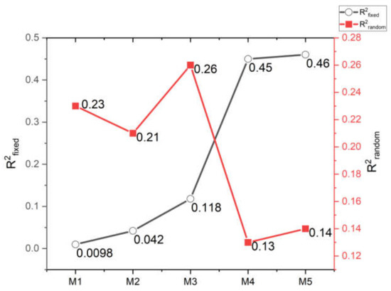 - Nakagawa, S.; Johnson, P.C.D.; Schielzeth, H. The coefficient of determination R-2 and intra-class correlation coefficient from generalized linear mixed-effects models revisited and expanded. J. R. Soc. Interface 2017, 14. [Google Scholar] [CrossRef] [Green Version]