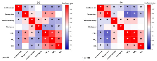 As shown in Figure 8a, temperature and relative humidity in northern cities were negatively correlated with the COVID-19 incidence rates. There was no obvious correlation between wind speed and COVID-19 incidence rates. Air pollution indicators were all negatively correlated to the COVID-19 incidence rates at a 5% significance level. In southern cities, temperature presented a positive correlation to COVID-19 incidence rates. On the other hand, relative humidity and wind speed were significantly negatively correlated to the COVID-19 incidence rates. Furthermore, all air pollution indicators were negatively correlated with the COVID-19 incidence rates (Figure 8b).