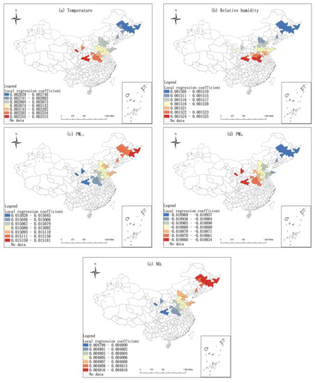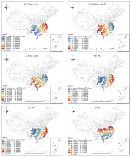Figure 9 and Figure 10 demonstrate that the influence of air pollutants and meteorological factors on the COVID-19 incidence rates was spatially heterogeneous. Among them, the influence of temperature, relative humidity, and PM10 on the epidemic situation in northern China is mainly zonal differentiation, with the smallest influence on northeast China and the largest influence on northwest China (Figure 9a,b,d). The influence of PM2.5 and NO2 on the epidemic situation in northern China decreases gradually from northeast to northwest, with the northeast region being the most affected and the northwest region being the least affected (Figure 9c,e). The influence of temperature, PM2.5, and PM10 on the epidemic situation in southern China gradually decreases from southeast to southwest. That is, the southeast is the most affected and the southwest is the least affected (Figure 10a,d,e). The influence of wind speed and relative humidity on the epidemic situation in southern China increases from east to west (Figure 10b,c). The influence of NO2 on the epidemic pattern in southern China has obvious zonal differentiation characteristics, and the degree of influence decreases gradually from north to south, with the northern region being the most affected and the southern region being less affected (Figure 10f).