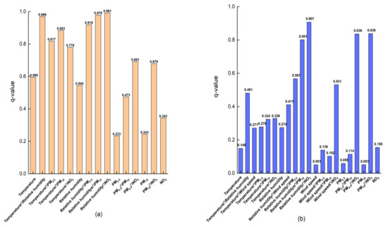 Single-factor detection and multi-factor interactive analysis of meteorological and pollution factors were carried out on the COVID-19 incidence rates of cities in China using the geographic detector. In northern cities, the factor detector was used to determine the influence degree of each influencing factor on the COVID-19 incidence rates. It can be seen from Figure 11a that, the q values of all influencing factors ranged from 0.233 to 0.595, and the magnitude of the significant difference was as follows: temperature (0.595) > relative humidity (0.544) > NO2 (0.343) > PM10 (0.243) > PM2.5. The influence of temperature and relative humidity on the change in COVID-19 incidence rates ranked the first two, indicating that meteorological factors played a leading role in the change in COVID-19 incidence rates. Secondly, NO2, which covers all aspects of human activities, including industrial activities and transportation resources, so the change in NO2 concentration can quantify the intensity of human activities, which can reflect the impact of human activities on COVID-19 incidence rates to a certain extent. PM10 and PM2.5 also had a great influence on the COVID-19 incidence rates.