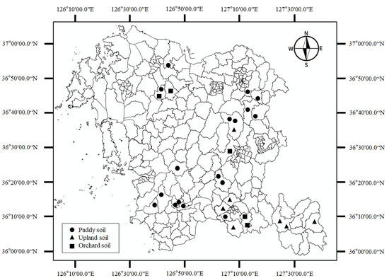 The study sites were in the Chungcheongnam-do province of South Korea. The map of the study area is shown in Figure 1. The soil samples were collected from three different types of cropland including orchards, paddy and upland fields. The soils predominantly belong to the Inceptisol class but considerable amounts of Entisols exist, especially along the coast while Ultisols exist only in infinitesimal quantities (the soil class categorisation is based on the USDA soil taxonomy). The soils in this region formed from both metamorphic and acidic rocks and are weakly acidic with pH ranges of between 5.5 and 6.0 (http://soil.rda.go.kr/eng/soils/survey.jsp, accessed on 14 March 2022). The predominant soil texture is sandy loam but clay loam is predominant along the areas abutting the coast. A total of 87 soil cores were picked with an auger from three different agricultural land use types which included paddy fields (51 cores), upland fields (21 cores) and orchard fields (15 cores). The soil was dug to a depth of 70 cm. The auger containing the soil sample was covered tightly with a plastic wrap to prevent the evaporation of water and then taken to the laboratory for further processing.