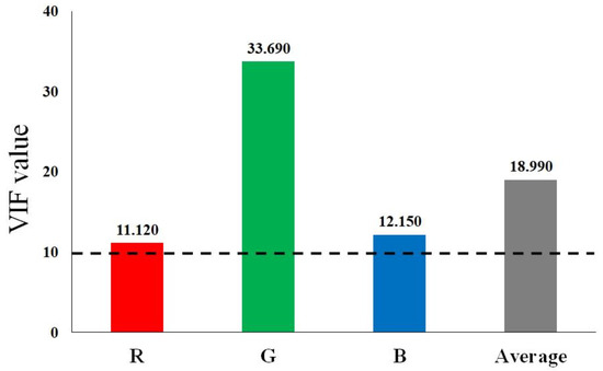The possibility of the existence of multicollinearity was adjudged to be high due to the exceedingly high correlations among the R, G and B values. When multicollinearity occurs, the variance of the regression coefficient increases which results in the estimate of the regression coefficient being unstable, and thus, it becomes difficult to interpret the results. As shown in Figure 3, the VIF values of R, G and B were 11.120, 33.690 and 12.150, respectively, with an average value of 18.990 and hence, the probability of the occurrence of multicollinearity was confirmed to be high. Consequently, the components that did not correlate with each other amongst the R, G and B values but reflected the variances of R, G and B were extracted through the PCA. Amongst the three principal components extracted, the first principal component (component 1) and the second principal component (component 2) were found to explain 99.4% of the total variance, as shown in Table 5. Therefore, the third principal component (component 3) was excluded from the regression analysis because its weight (importance) was too insignificant.