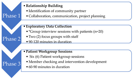 Data presented are a subset from an exploratory sequential mixed methods [33] study that used a community-partnered participatory research (CPPR) approach [34] to adapt an evidence-based digital storytelling intervention [29,35] for supporting continued MOUD treatment engagement. The parent study consisted of three phases: relationship building, exploratory data collection, and patient workgroup sessions (Figure 1). Data in this manuscript draw from qualitative findings related to treatment engagement that surfaced during group and individual conversations with patients regarding adaptability and feasibility of a digital storytelling intervention during phase two of the project. Qualitative methods are best suited to generate novel findings that prompt innovations [36], of particular value when conducting research with a stigmatized population and topic (i.e., women and M/OUD).