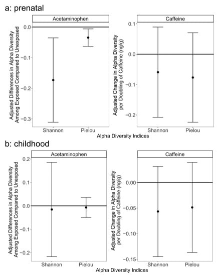 Association between acetaminophen/caffeine concentrations in (a) meconium (n = 49) and (b) 6–7-year-old stool (n = 85) and alpha diversity. Diversity was measured with Shannon Diversity Index and Pielou Evenness Index. Whiskers represent 95% confidence intervals. Models are adjusted for whether the child was ever breastfed, sex, mode of birth, and family income.