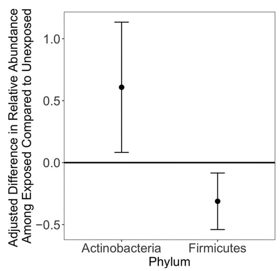 Association between prenatal exposure to acetaminophen and phyla (n = 49). Whiskers represent 95% confidence intervals. Models adjust for whether the child was ever breastfed, sex, mode of birth, and family income.