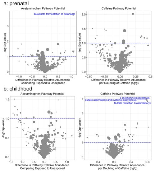 Association between (a) prenatal (n = 49) and (b) childhood exposure (n = 85) to caffeine or acetaminophen and relative abundance of functional pathways. Effect estimates for caffeine are expressed per doubling of exposure. Effect estimates for acetaminophen are comparing exposed to unexposed. Models are adjusted for whether the child was ever breastfed, sex, mode of birth, and socioeconomic status. Point size is proportional to average relative abundance of the represented pathway. Pathways with an FDR q-value < 0.1 are labeled. Full names: L-methionine biosynthesis = Superpathway of L-methionine biosynthesis (by sulfhydrylation); Sulfate assimilation and cysteine biosynthesis = Superpathway of Sulfate assimilation and cysteine biosynthesis.