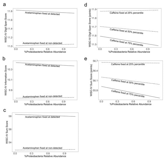 Interaction between meconium concentrations of caffeine and acetaminophen with Proteobacteria (n = 49). Models are adjusted for whether the child was ever breastfed, sex, mode of birth, and socioeconomic status. In (a–c), solid lines show the association when acetaminophen is detected, and dashed lines show the association when acetaminophen is not detected. In (d–e), solid lines show the association when caffeine is at the 75th percentile, dashed lines show when caffeine is at the 50th percentile, and dash-dot lines show when caffeine is at the 25th percentile. Subfigures (a,d) show the association between Proteobacteria and WISC-IV Digit Span scores; subfigure (b) shows the association between Proteobacteria and WISC-IV Information scores; subfigures (c,e) show the association between Proteobacteria and WISC-IV summary scores.