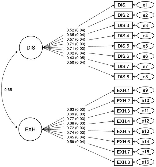 CFA Model of the Burnout Measurement. DIS: disengagement from work, EXH: exhaustion, n = 396. Residual correlations between the following pairs of items were added to the model: item DIS.1 with item DIS.3 (=0.353, SE = 0.050, p < 0.001); item DIS.2 with item DIS.6 (=0.224, SE = 0.056, p < 0.001); item DIS.1 with item DIS.8 (=0.165, SE = 0.04, p < 0.001); item DIS.7 with item DIS.8 (=0.279, SE = 0.049, p < 0.001); item EXH.2 with item EXH.8 (=0.236, SE = 0.057, p < 0.001); item DIS.6 with item DIS.8 (=0.324, SE = 0.057, p < 0.001).