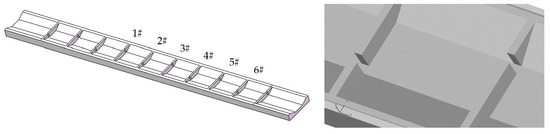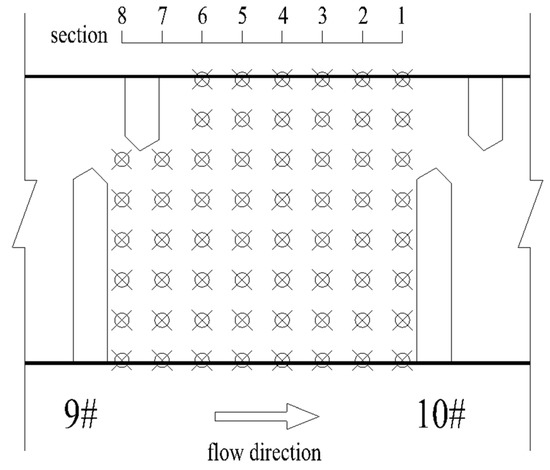 In order to verify the velocity distribution in the fishway pool, the numerical model is verified by using the data of a physical model test of another fishway. The common pool length is 3.0 m, the pool width is 2.5 m, the vertical-slot width is 0.4 m, the water depth is 1.5 m, and the bottom slope is 1/100. The geometric scale of the physical model is 5. The simulation area includes 11 common pools and one resting pool, including 6 pools upstream of the resting pool and 5 pools downstream, with a total of 13 vertical slots (numbered from upstream to downstream 1–13). The study verified the maximum flow velocity of the vertical slot along the fishway from 3 to 11, and the verification results are shown in Figure 3. The velocity measurement data of a typical pool were selected for further verification, the distribution of measuring points is shown in Figure 4, and the comparison of the simulated and measured values is shown in Figure 5, where indicates the width direction of the pool. The validation results show that the simulated and measured values match well, and the maximum deviation between the simulated and measured values of the maximum velocity of the vertical slots is 4.55%, which indicates that the numerical model can simulate the hydraulic characteristics well and can be used for subsequent studies.