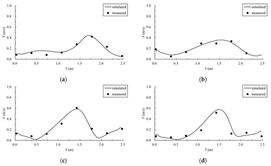 Comparison of simulated and measured velocities in the pool. (a) Section 1; (b) Section 2; (c) Section 5; (d) Section 6.