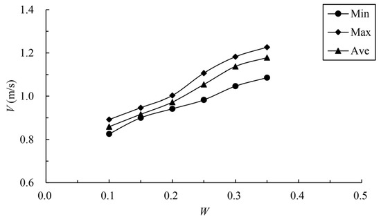 The calculated results of the maximum velocity of different vertical slots in the fishway with different permeability ratios are shown in Table 2 and Figure 6. It can be seen from the figure that with the increase in the permeability ratio, the minimum, maximum and average values of the maximum velocity of vertical slots show a gradually increasing trend. Based on the case of , when the permeability ratio increases by 50%, 100%, 150%, 200% and 250%, the average maximum velocity of vertical slots increases by 6.7%, 13.25%, 22.76%, 32.44% and 37.22%, respectively. When the permeability ratio is 0.25, the maximum velocity of vertical slots reaches 1.107 m/s, the average maximum velocity reaches 1.054 m/s, and the area range of exceeded velocity is about 5%. When the permeability ratio reaches 0.30, the maximum velocity reaches 1.182 m/s and the average maximum velocity reaches 1.137 m/s; the area range of exceeded velocity is about 19%. When the permeability ratio reaches 0.35, the maximum velocity reaches 1.227 m/s and the average maximum velocity reaches 1.179 m/s; the area range of exceeded velocity is about 33%. It can be seen that the permeability ratio is the main factor affecting the maximum velocity of the control section. Even if the maximum velocity exceeds the limit, there is still a certain range of channels available for fish to move up. To meet the basic requirements, the permeability ratio of the partition wall should be no more than 0.30.