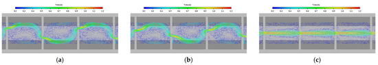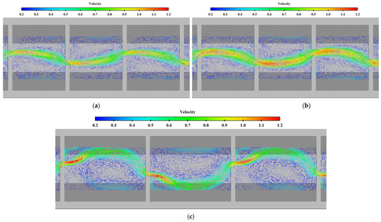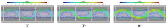 Comparison of flow patterns in middle layer under different offset ratios (unit: m/s). (a) R = 0.6; (b) R = 0.3; (c) R = 0.