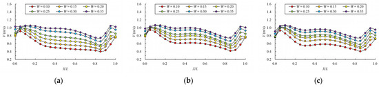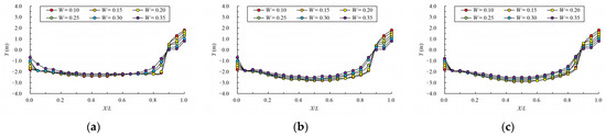 Figure 8 and Figure 9 give the mainstream velocity variation and mainstream trajectory variation for different analyzed water layers under different cases. indicates the longitudinal coordinate of the section, indicates the length of the pool, indicates the maximum velocity of the pool, and represents the transverse position of the section where the maximum velocity is located (the centerline position of the pool is recorded as 0). From the variation in mainstream velocity along the flow path, the attenuation laws of velocity in different water layers are similar. The mainstream velocity decreases gradually near the control section and then increases near the next control section. The flow diffusion is sufficient, and the energy dissipation effect is good. The main flow is on one side, comparing the data from three water layers, due to the bottom layer having the smallest water area, and the main flow collides with the side slope faster; the velocity of the mainstream decays faster, so the energy dissipation is slightly better than the middle layer and surface layer. Additionally, the surface layer has the largest water area, so the water flow diffusion is more adequate, and the velocity attenuation is slightly better than the middle layer. The attenuation law of velocity under different permeability ratios is similar. When the permeability ratio is less than 0.30, the maximum velocity can be attenuated to about 0.4 m/s–0.7 m/s, but when the permeability ratio reaches 0.35, the maximum velocity can be attenuated to about 0.8 m/s. The high velocity in the pool may adversely affect the passing fish, so it is appropriate to control the permeability ratio below 0.30. From the change in mainstream trajectory, due to the vertical slot being close to the bottom of the side slope, the mainstream trajectory of each case is consistent. The mainstreams all, first, are biased to the side of the short partition wall, and then collide with the side slope and turn to the next vertical slot. The spans of mainstream trajectories flowing through are slightly different. There are different degrees of mainstream distortion, especially when the permeability ratio is small and the mainstream distortion is large, which should be avoided in the design but it can be optimized by adjusting the offset ratio.
