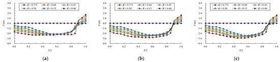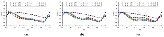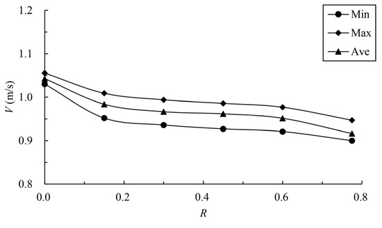 The calculated results of the maximum velocity of different vertical slots with different offset ratios are shown in Table 3 and Figure 10. Figure 11 compares the velocity vector in the middle layer under typical offset ratio cases. The mainstream velocity variation and mainstream trajectory variation for different analyzed water layers are shown in Figure 12 and Figure 13. The results show that when the offset ratio R ≥ 0.15, the maximum, minimum and average values of the data for different cases are not particularly different and are roughly distributed between 0.90 m/s and 1.00 m/s. When , the upstream and downstream pools form a direct
