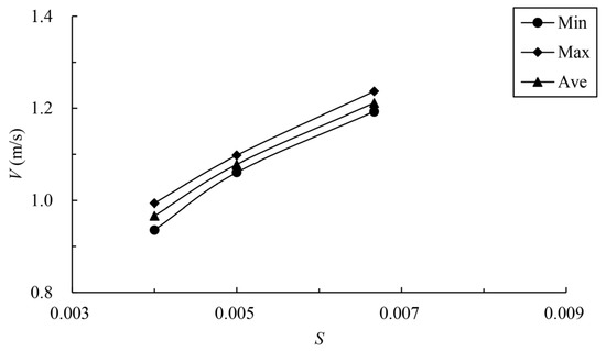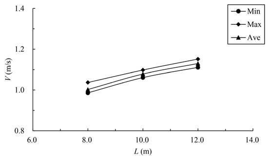 When the bottom slope is 1/200, the results of maximum velocity of vertical slots with different pool length under the typical permeability ratio and offset ratio are shown in Table 5 and Figure 18. The velocity vectors under typical cases are shown in Figure 19. It can be seen from the chart that the maximum, minimum and average data increase with the increase in the pool length under the same permeability ratio and offset ratio. The reason is that when the bottom slope and the water depth of the pool are fixed, the longer the length of the pool, and the greater the head consumed by the unit pool. When , and , the average datum is 1.123 m/s. When the length