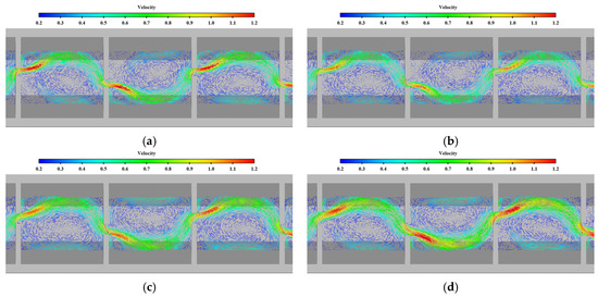 Comparison of flow patterns in middle layer under different bottom slopes (unit: m/s). (a) W = 0.15, S = 1/150; (b) W = 0.15, S = 1/200; (c) W = 0.2, S = 1/200; (d) W = 0.25, S = 1/200.