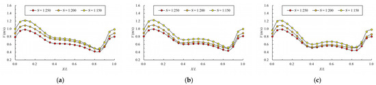 Mainstream trajectory under different offset ratios. (a) bottom layer; (b) middle layer; (c) surface layer.