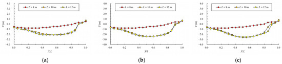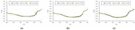 Mainstream trajectory under different pool lengths. (a) bottom layer; (b) middle layer; (c) surface layer.