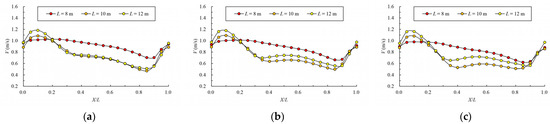 The variation law of mainstream velocity along the path and the variation law of the mainstream trajectory are shown in Figure 20 and Figure 21. It can be seen from the chart that when the length of the pool is 10 m and 12 m, the mainstream is biased towards one side, and the attenuation law of the velocity and the mainstream trajectory is roughly the same. The velocity in the fishway pool can quickly decay to about 0.4 m/s, so the energy dissipation efficiency is high. When the length of the pool is adjusted to 8 m, the flow pattern in the pool changes, which is similar to the “direct jet”. In this case, the mainstream tends towards the center of the pool and bypasses within the pool. The mainstream is less affected by the side slope, so the attenuation of velocity is reduced, with the maximum velocity decaying to about 0.6 m/s in the surface layer and the maximum velocity being slightly higher in the middle and bottom layers. Although the energy dissipation efficiency in the pool is reduced, the mainstream trajectory is smoother, which is conducive to the fish to find the mainstream to upstream more quickly. Therefore, the study considers that the shortening of the pool length to 8 m slightly improves the flow pattern, and suggests optimizing the pool length to 8 m.