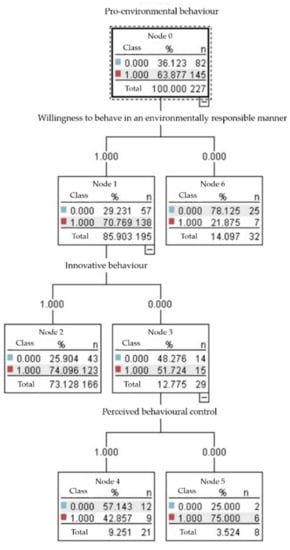 Firstly, based on the results of the decision-tree model, it can be seen that the predictors of university students’ pro-environmental behaviour are in order of importance, willingness to behave in an environmentally responsible manner, environmental activism, subjective norms, sense of place, innovative behaviour, social identity, and perceived behavioural control.