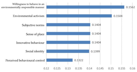 According to Figure 2, the predictor variables for pro-environmental behaviour are willingness to behave in an environmentally responsible manner, innovative behaviour, and perceived behavioural control. The percentage of those with high pro-environmental behaviour was 63.88%. According to Figure 3, the importance of willingness to to behave in an environmentally responsible manner is 0.1562, innovative behaviour is 0.1404, and perceived behavioural control is 0.1322.