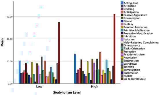 Mean levels of the defense mechanisms and the Lie scale by low and high Studyholism.