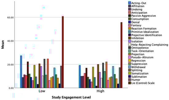 Mean levels of the defense mechanisms and the Lie scale by low and high Study Engagement.