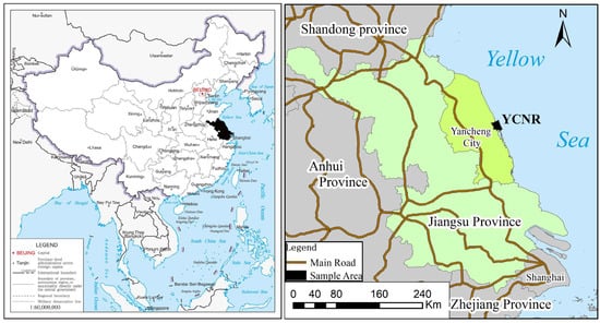 The study area is located in the coastal zone of Yancheng, Jiangsu, east of the Yellow Sea, in the area ranging from 119°27′ E to 120°54′ E and from 32°34′ N to 34°28′ N (Figure 1). The topography of the region is plain. The north and south regions were formed by the sedimentation of sediment carried by the Yangtze River and the Yellow River and through the action of ocean tides and wind waves. These regions are silty intertidal wetlands. The study area is located in a transition zone from subtropical to warm temperate. The annual sunshine time is 1956.5 h, the annual average temperature is 15.8 Celsius, and the annual precipitation is 697.3 mm. The type of wetland ecosystem found in the area is well preserved, and the impact of S. alterniflora invasion is prominent. Yancheng Nature Reserve, which is a Ramsar wetland of international importance, joined the Convention Concerning the Protection of the World Cultural and Natural Heritage in 2019. The unique tidal wetland ecosystem in the reserve is the habitat for rare birds, an important resting place for migratory birds from northeast Asia and Australia, and an important wintering place for waterfowl. This area is also rich in wetland biodiversity, and it occupies a very important position in international biodiversity conservation.